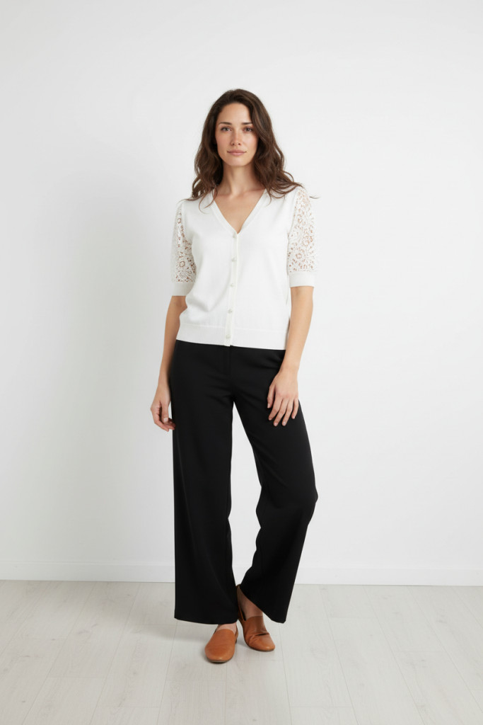 Micha fehér alapon vékony kötött ujján csipkés,elején gyöngyös-gombos kardigán.