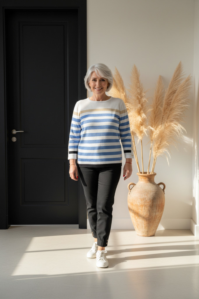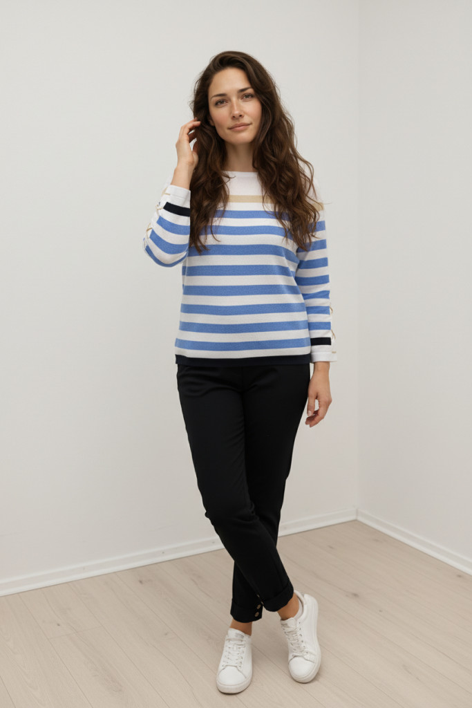 Micha fehér alapon beige-világoskék csíkos vékony kötött felső.