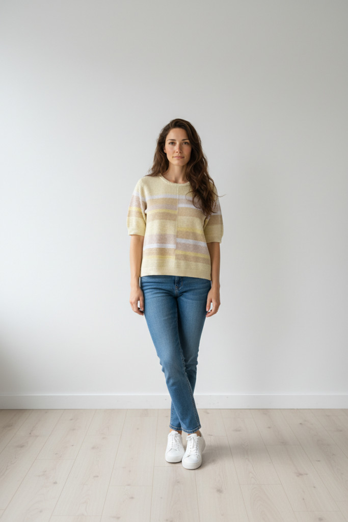 Micha beige-sárga vékony kötött rövid ujjú felső.