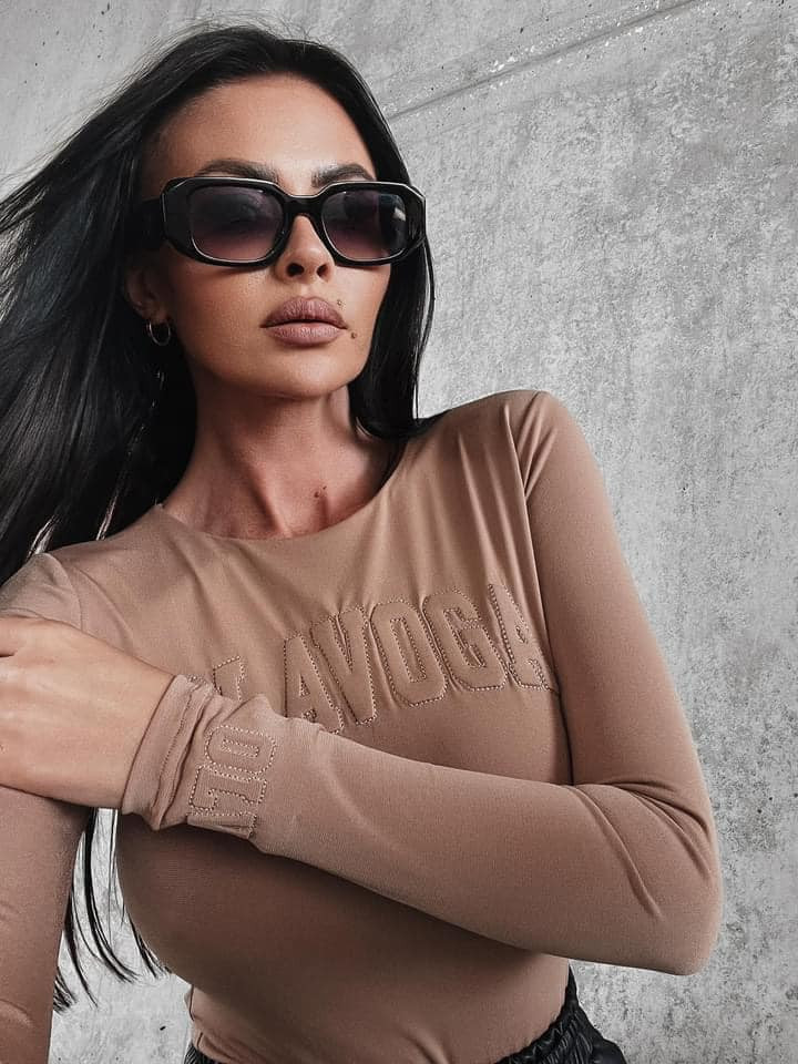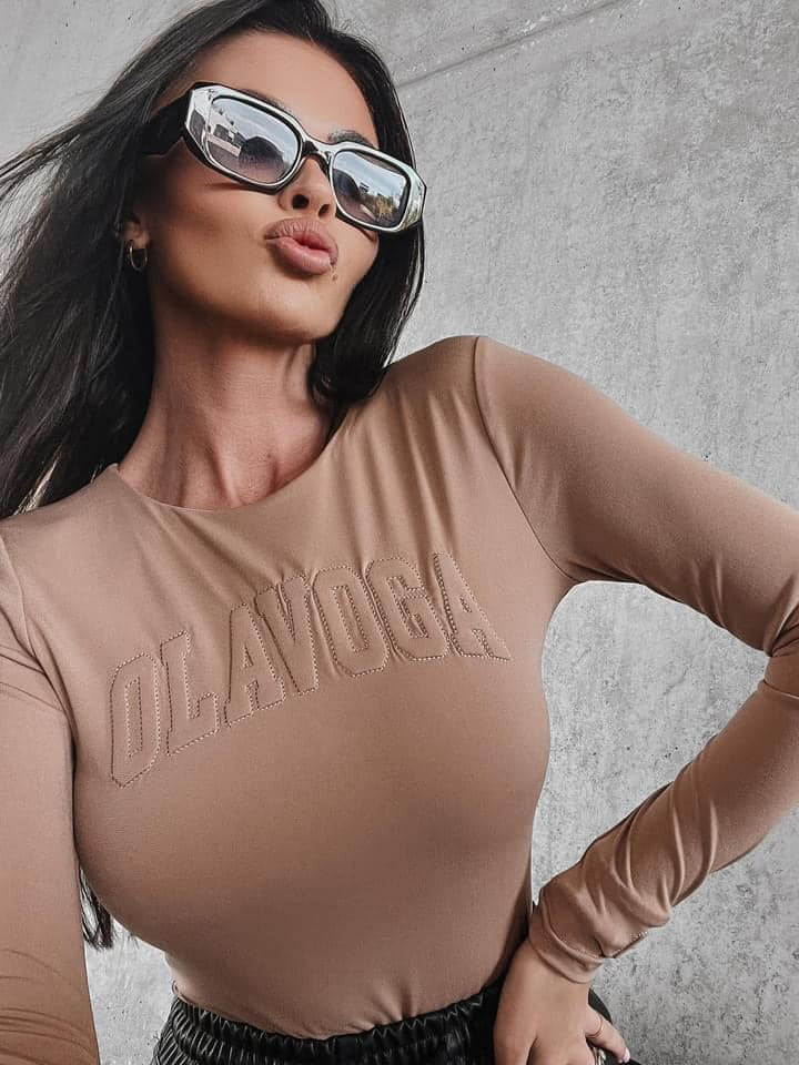 O'la Voga világosbarna színű, elején varrt feliratos, karcsúsított fazonú body.