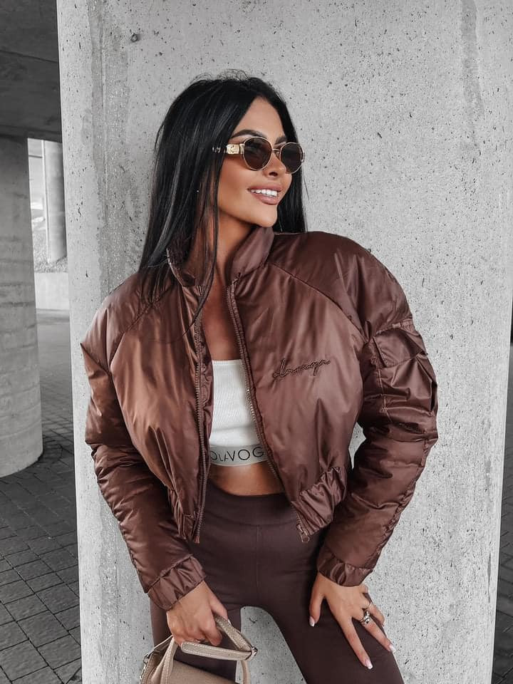 O'la Voga barna színű, barna hímzett feliratos, alján és ujja végén gumírozott, rövidített fazonú dzseki.