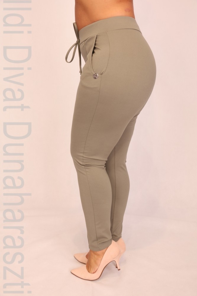 Viktori khaki színű, derékban gumis, elején kötős, zsebes, élén varrott, sportos nadrág.