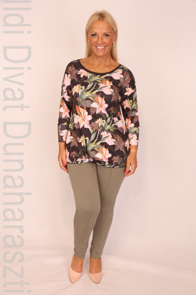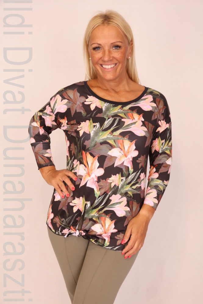 Tara Collection fekete alapon virágmintás, elején kötős, ujj végén passzés, lezser fazonú felső.