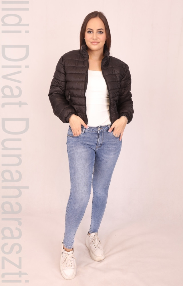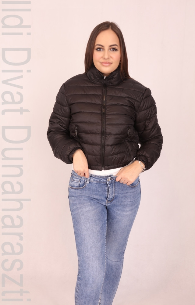 Spring Edition fekete színű, steppelt anyagú, álló nyakú, zsebes, alján és ujja végén kör gumírozott, rövidített fazonú kabát.