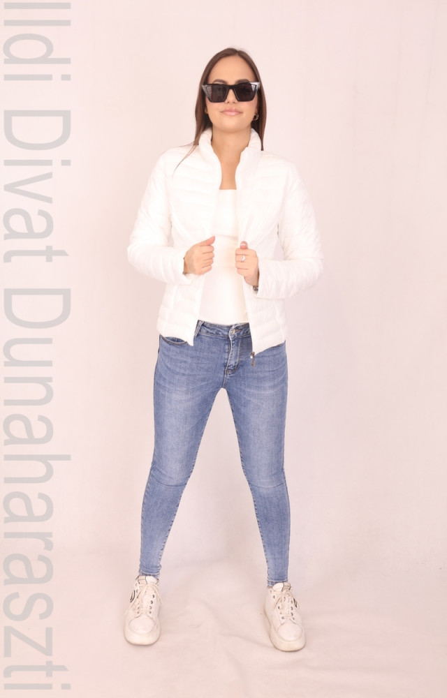 Spring Edition fehér színű, steppelt anyagú, álló nyakú, zsebes, karcsúsított fazonú kabát.