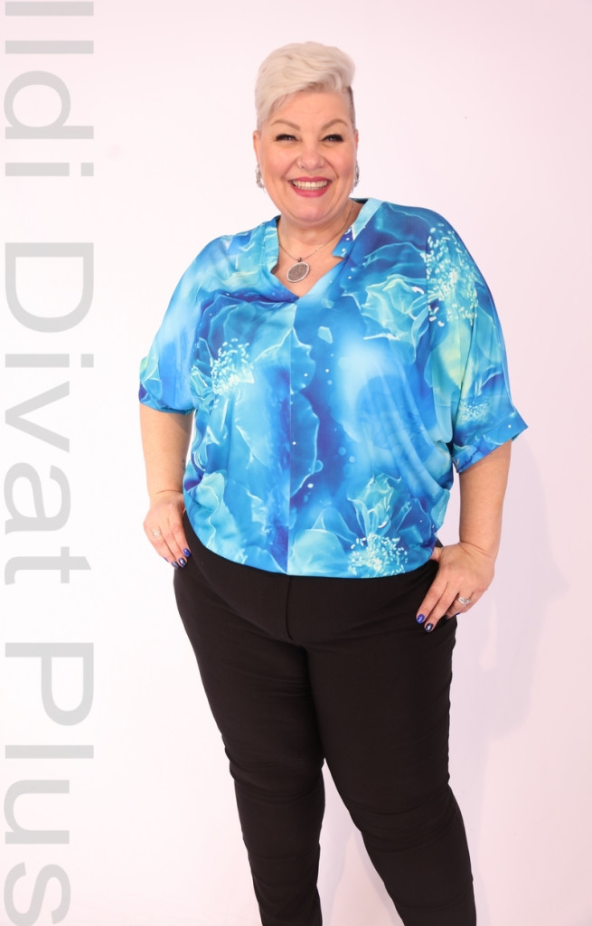 Zita királykék-menta virágos V nyakú alján gumis felső.