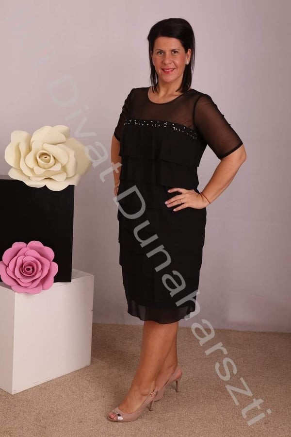 Szyk fekete színű, tetején necces és strasszos, fodros, egyenes fazonú ruha.